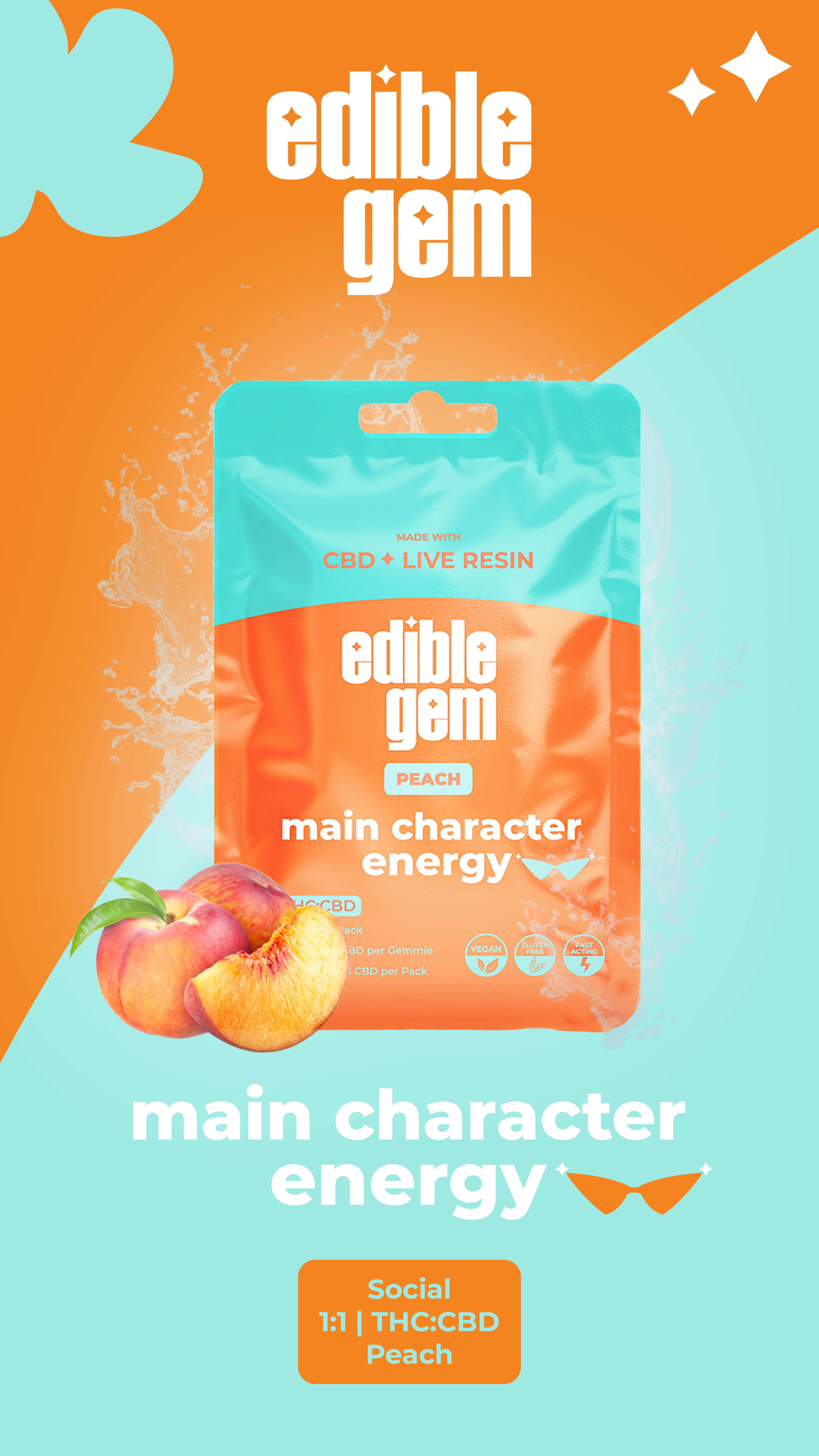 Edible Gem | Peach Main Character Energy Live Resin Gummies | 1:1 THC:CBD | 200mg