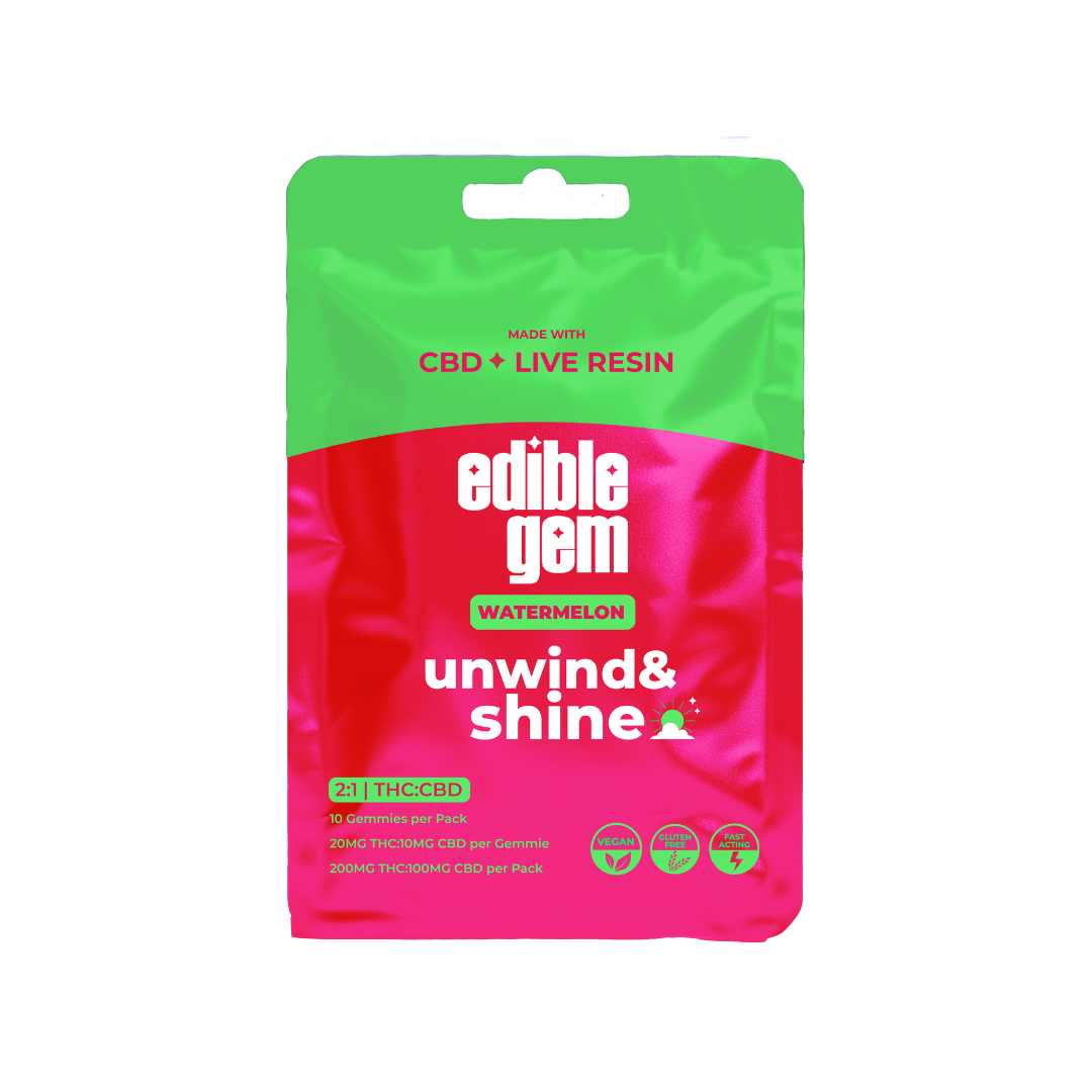 Unwind & Shine Watermelon | 2:1 CBD:THC | 10 x 20mg | 200mg | Live Resin | Edible Gem